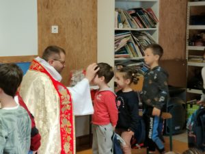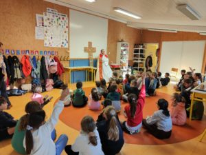 Pour lancer cette belle année, le Père David est venu à l’école et a béni chaque enfant, chaque cartable ainsi que l’école.